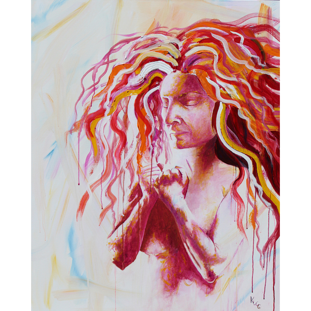 - Artistic Depiction: Showcases a female figure in prayer, drawing upon inner strength amidst a vibrant, fiery hair depiction.