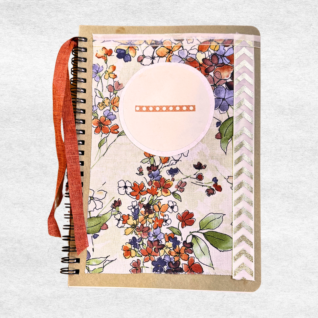 • Unlined journal with a cover decorated by Katy using fabric and paper