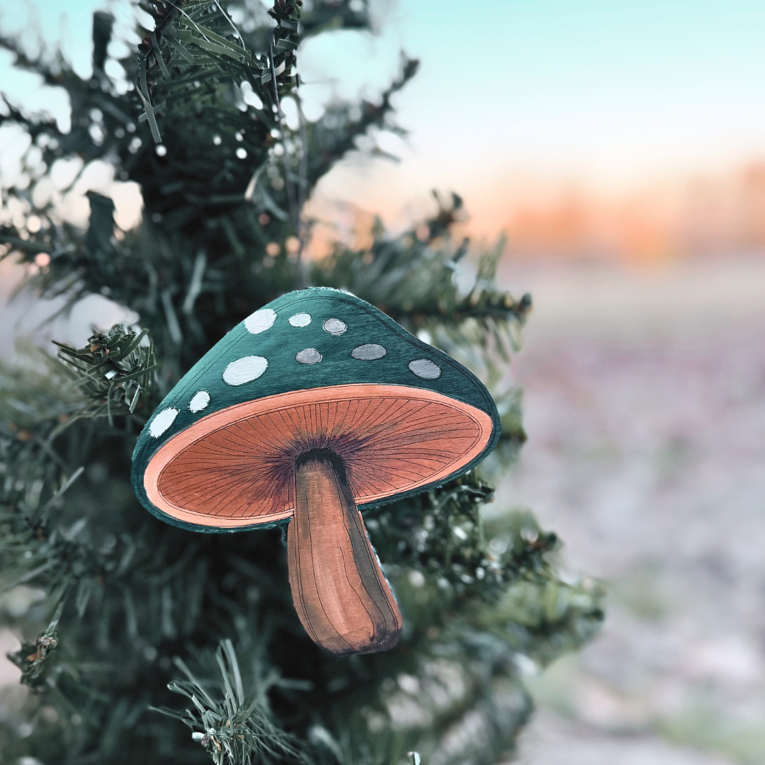 These Hand-Painted Wooden Mushroom Ornaments bring a bright, cheerful touch to any holiday tree. Each ornament is a flat wooden die-cut, individually hand-painted by mixed media artist Katy Casillas-Gray, giving every piece its own subtle character and charm.